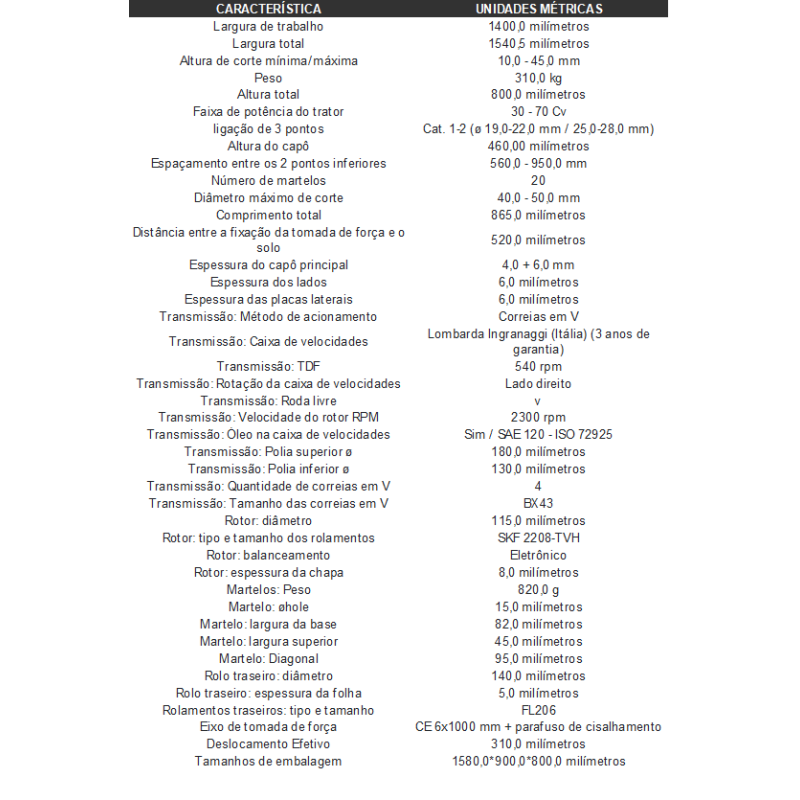 Largura De Trabalho 140 Cm - Peso 310 Kg.